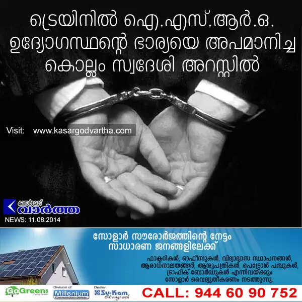 ട്രെയിനില് ഐ.എസ്.ആര്.ഒ. ഉദ്യോഗസ്ഥന്റെ ഭാര്യയെ അപമാനിച്ച കൊല്ലം സ്വദേശി അറസ്റ്റില്