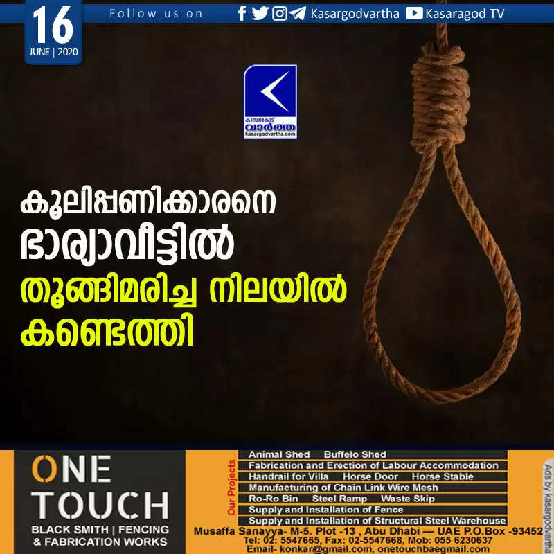 Keywords: Cheruvathur, kasaragod, Kerala, News, Death, Hanged, House, Man found dead at Wife house