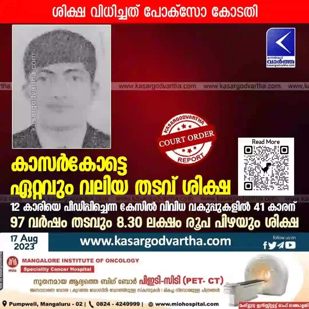 Court Verdict | കാസര്കോട് ജില്ലയിലെ ഏറ്റവും വലിയ തടവ് ശിക്ഷ; 12 കാരിയെ പീഡിപ്പിച്ചെന്ന കേസില് വിവിധ വകുപ്പുകളില് 41 കാരന് 97 വര്ഷം തടവും 8.30 ലക്ഷം രൂപ പിഴയും ശിക്ഷ