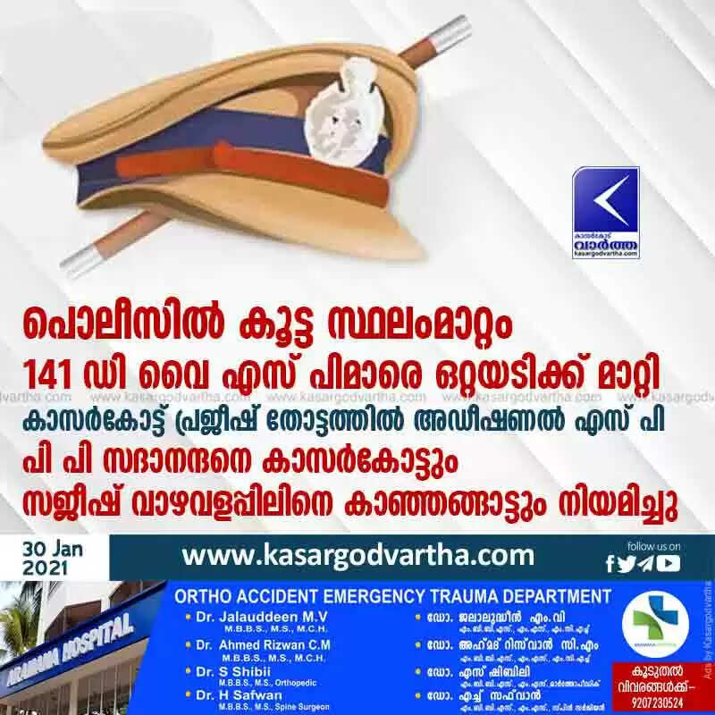 പൊലീസില് കൂട്ട സ്ഥലംമാറ്റം; 141 ഡി വൈ എസ് പിമാരെ ഒറ്റയടിക്ക് മാറ്റി; കാസര്കോട്ട് പ്രജീഷ് തോട്ടത്തില് അഡീഷണല് എസ് പി; പി പി സദാനന്ദനെ കാസര്കോട്ടും സജീഷ് വാഴവളപ്പിലിനെ കാഞ്ഞങ്ങാട്ടും നിയമിച്ചു