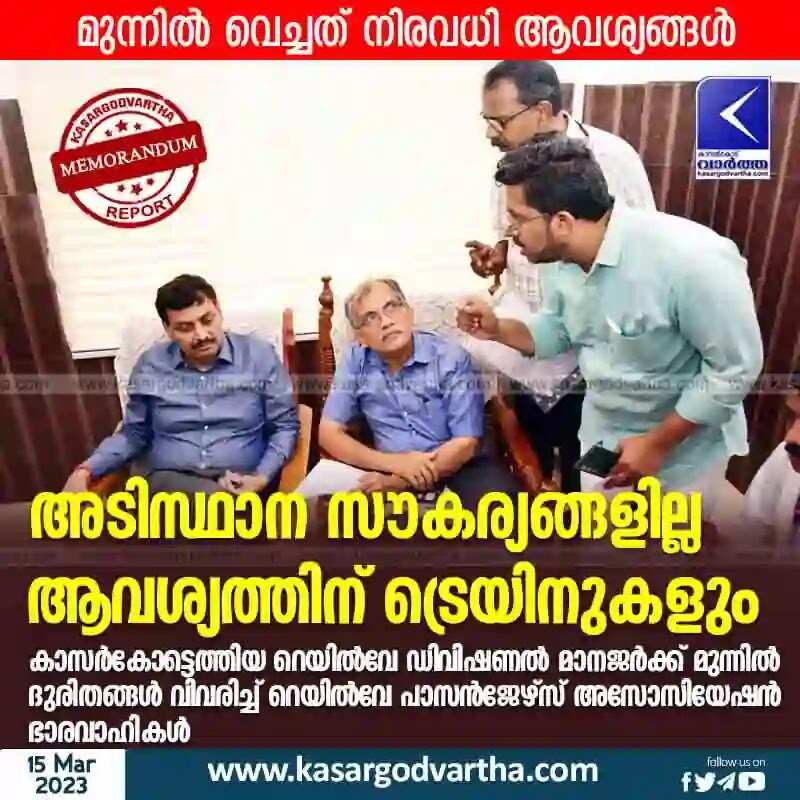 Railway | അടിസ്ഥാന സൗകര്യങ്ങളില്ല, ആവശ്യത്തിന് ട്രെയിനുകളും; കാസര്‍കോട്ടെത്തിയ റെയില്‍വേ ഡിവിഷണല്‍ മാനജര്‍ക്ക് മുന്നില്‍ ദുരിതങ്ങള്‍ വിവരിച്ച് റെയില്‍വേ പാസന്‍ജേഴ്‌സ് അസോസിയേഷന്‍ ഭാരവാഹികള്‍