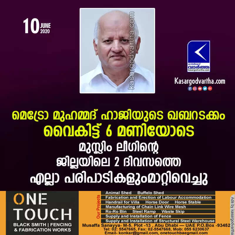 Keywords: Kasaragod, Kanhangad, Kerala, News, Burial, Metro Mohammed Haji's burial on 6 pm
