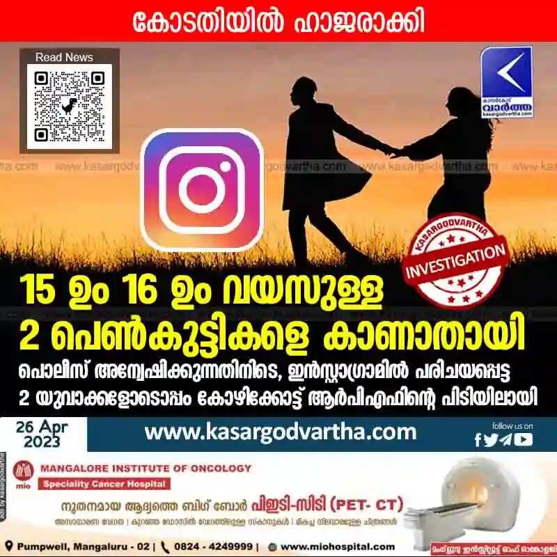 Missing case | 15 ഉം 16 ഉം വയസുള്ള 2 പെണ്കുട്ടികളെ കാണാതായി; പൊലീസ് അന്വേഷിക്കുന്നതിനിടെ, ഇന്സ്റ്റാഗ്രാമില് പരിചയപ്പെട്ട 2 യുവാക്കളോടൊപ്പം കോഴിക്കോട്ട് ആര്പിഎഫിന്റെ പിടിയിലായി