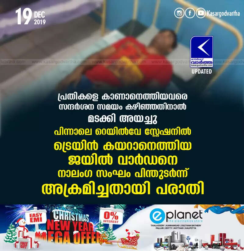 പ്രതികളെ കാണാനെത്തിയവരെ സന്ദര്ശന സമയം കഴിഞ്ഞതിനാല് മടക്കി അയച്ചു; പിന്നാലെ റെയില്വേ സ്റ്റേഷനില് ട്രെയിന് കയറാനെത്തിയ ജയില് വാര്ഡനെ നാലംഗ സംഘം പിന്തുടര്ന്ന് അക്രമിച്ചതായി പരാതി