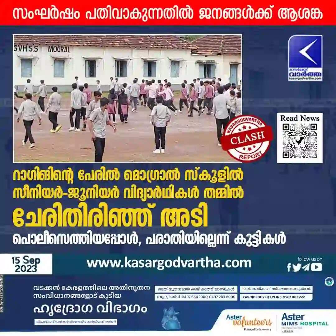 Clash | റാഗിങിന്റെ പേരിൽ മൊഗ്രാൽ സ്കൂളിൽ സീനിയർ - ജൂനിയർ വിദ്യാർഥികൾ തമ്മിൽ ചേരിതിരിഞ്ഞ് അടി; പൊലീസെത്തിയപ്പോൾ, പരാതിയില്ലെന്ന് കുട്ടികൾ; സംഘർഷം പതിവാകുന്നതിൽ ജനങ്ങള്ക്ക് ആശങ്ക