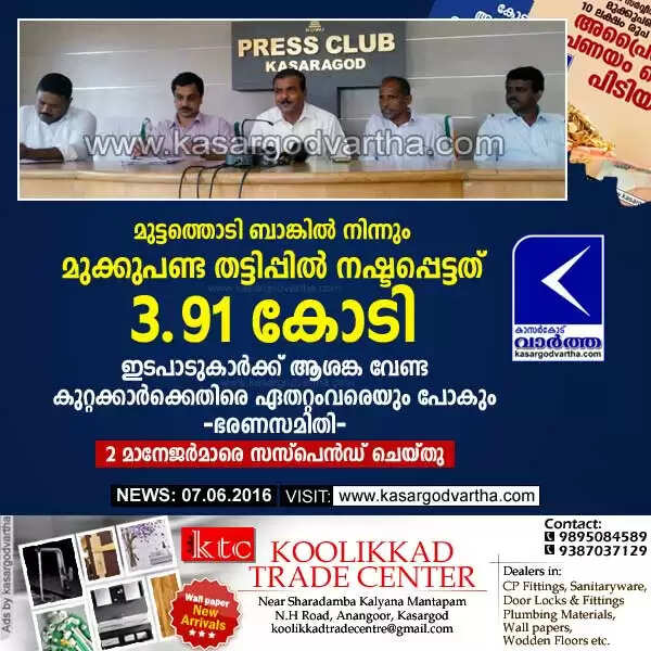 മുട്ടത്തൊടി ബാങ്കില് നിന്നും മുക്കുപണ്ട തട്ടിപ്പില് നഷ്ടപ്പെട്ടത് 3.91 കോടി; ഇടപാടുകാര്ക്ക് ആശങ്ക വേണ്ട, കുറ്റക്കാര്ക്കെതിരെ ഏതറ്റംവരെയും പോകും: ഭരണസമിതി