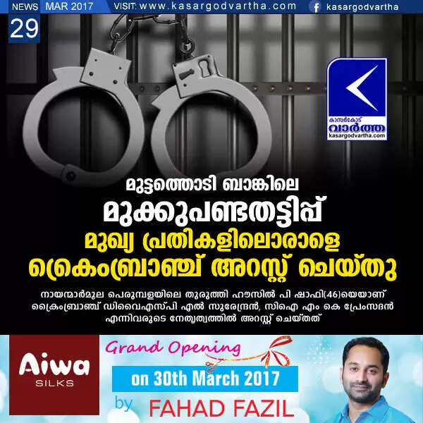 Keywords: Kasaragod, Kerala, news, Bank, Fraud, arrest, Crimebranch, Fake Gold, P Shafi, Muttathodi, Muttathody bank cheating: accused arrested