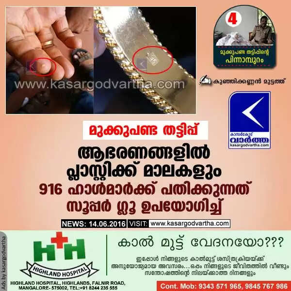മുക്കുപണ്ട തട്ടിപ്പ്: ആഭരണങ്ങളില് പ്ലാസ്റ്റിക്ക് മാലകളും, 916 ഹാള്മാര്ക്ക് പതിക്കുന്നത് സൂപ്പര് ഗ്ലൂ ഉപയോഗിച്ച്