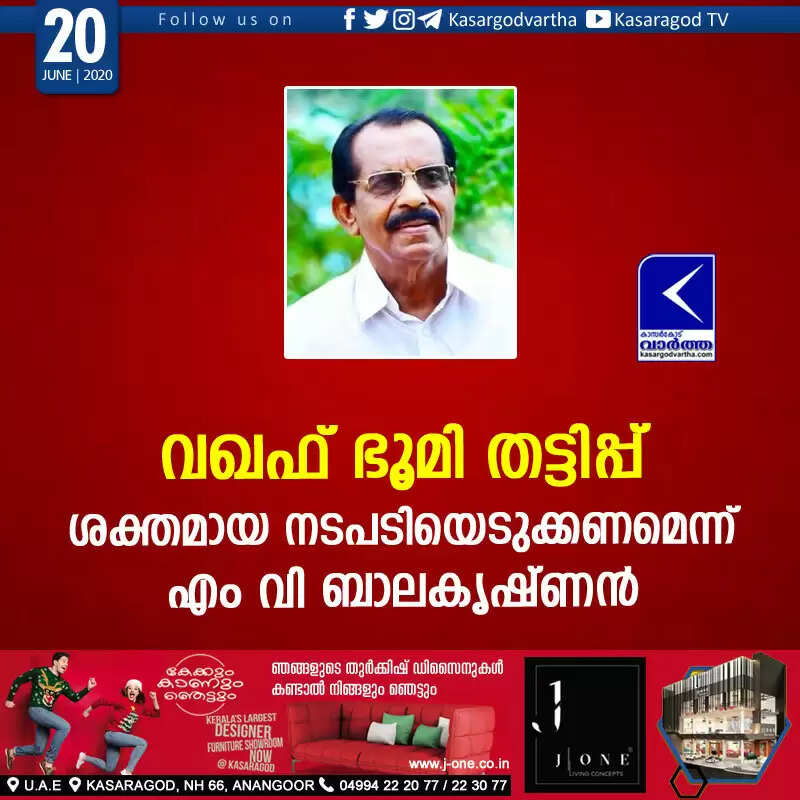 കാസര്‍കോട്: (www.kasargodvartha.com 20.06.2020) മുസ്ലീം ലീഗ് എം എല്‍ എ അടക്കമുള്ള ജനപ്രതിനിധികള്‍ വഖഫ് ഭൂമി തട്ടിയെടുത്ത സംഭവത്തില്‍ ശക്തമായ നടപടിയെടുക്കണമെന്ന് സി പി എം ജില്ലാ സെക്രട്ടറി എം വി ബാലകൃഷ്ണന്‍ ആവശ്യപ്പെട്ടു. തൃക്കരിപ്പൂരിലെ ജാമിഅ സഅദിയ ഇസ്ലാമിയ അഗതി മന്ദിരത്തിന്റെ ഭൂമിയും സ്‌കൂള്‍ കെട്ടിടവും എംഎല്‍എ ഉള്‍പ്പെടെയുള്ള മുസ്ലിം ലീഗ് നേതാക്കള്‍ തട്ടിയെടുത്തെന്നാണ് മാധ്യമങ്ങള്‍ റിപ്പോര്‍ട്ട് ചെയ്തിരിക്കുന്നത്. ലീഗ് നേതാക്കളായ എം സി ഖമറുദീന്‍ എംഎല്‍എ, ജില്ലാ പഞ്ചായത്ത് പ്രസിഡന്റ് എ ജി സി ബഷീര്‍, വലിയപറമ്പ് പഞ്ചായത്ത് പ്രസിഡന്റ് എം ടി ജബ്ബാര്‍, തൃക്കരിപ്പൂര്‍ പഞ്ചായത്ത് സ്റ്റാന്‍ഡിംഗ് കമ്മിറ്റി ചെയര്‍മാന്‍ വി കെ ബാവ എന്നിവര്‍ ഉള്‍പ്പെടുന്ന  കോളേജ് ട്രസ്റ്റാണ് വഖഫ് ഭൂമി കൈയടക്കിയത്.