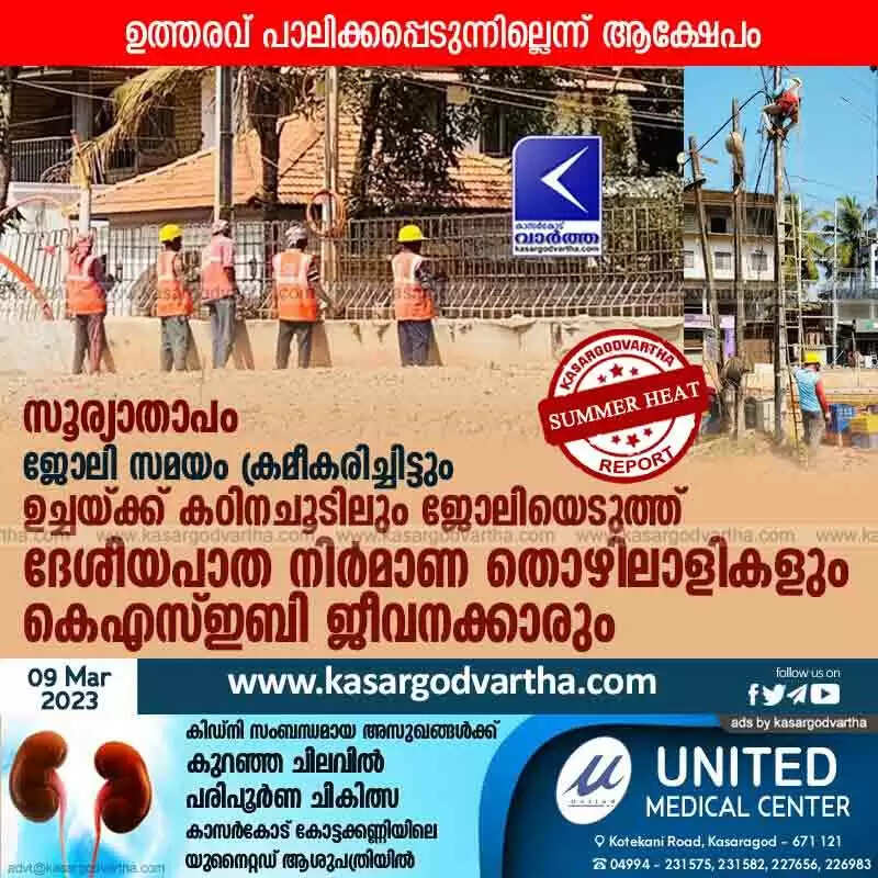 കുമ്പള: (www.kasargodavrtha.com) സംസ്ഥാനത്ത് പകൽ താപനില ക്രമാതീതമായി ഉയരുന്ന സാഹചര്യത്തിൽ വെയിലത്ത് ജോലി ചെയ്യുന്ന തൊഴിലാളികളുടെ ജോലി സമയം പുനഃക്രമീകരിച്ച് ലേബർ കമീഷണർ ഉത്തരവിട്ടിരുന്നു. എന്നാൽ ഇതൊന്നും ദേശീയപാത നിർമാണ തൊഴിലാളികളിലും കെഎസ്ഇബി ജീവനക്കാരിലും പാലിക്കപ്പെടുന്നില്ലെന്ന് ആക്ഷേപം. ഉത്തരവിനെ കുറിച്ച് ദേശീയപാത നിർമാണ തൊഴിലാളികളും, കെഎസ്ഇബി ജീവനക്കാരും അറിയാത്തതോ, ഉദ്യോഗസ്ഥർ അറിയിക്കാത്തതോയെന്നാണ് പൊതുജനങ്ങൾ ചോദിക്കുന്നത്.