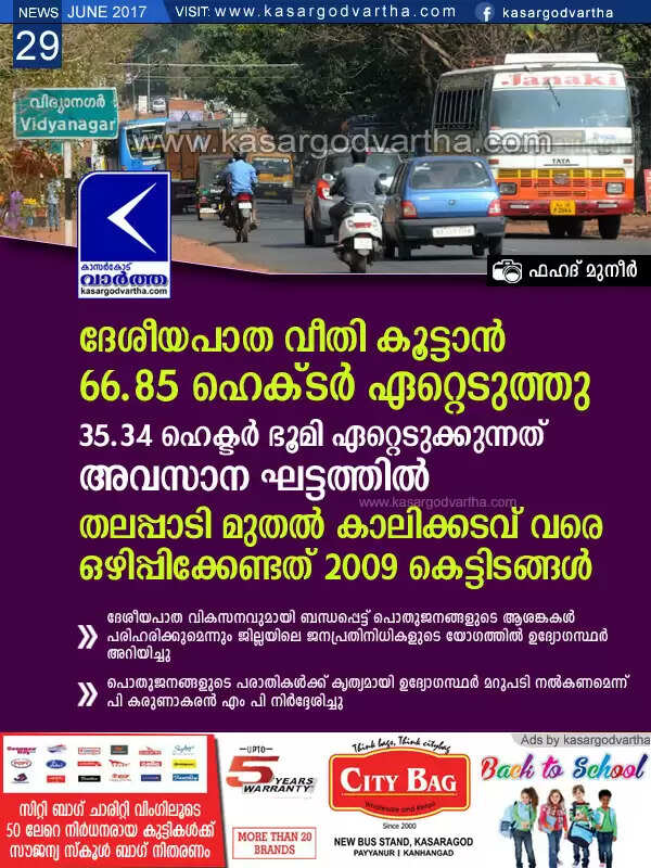 ദേശീയപാത വീതി കൂട്ടാന് 66.85 ഹെക്ടര് ഏറ്റെടുത്തു; 35.34 ഹെക്ടര് ഭൂമി ഏറ്റെടുക്കുന്നത് അവസാന ഘട്ടത്തില്; തലപ്പാടി മുതല് കാലിക്കടവ് വരെ ഒഴിപ്പിക്കേണ്ടത് 2009 കെട്ടിടങ്ങള്