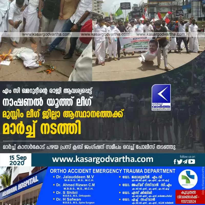 Keywords: Kasaragod, news, Kerala, National Youth League, March, Police, Muslim-league, inauguration, National Youth League marched to the district headquarters of the Muslim League demanding the resignation of MC Khamaruddin