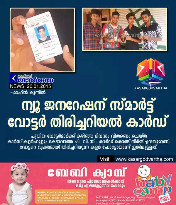 കാസര്കോട്: (www.kasargodvartha.com 26/01/2015) ബ്ലാക്ക് ആന്ഡ് വൈറ്റ് കാര്ഡിന് പകരം ഒടിയാത്ത കാര്ഡില് വര്ണ ചിത്രങ്ങളടങ്ങിയ വോട്ടര് തിരിച്ചറിയല് കാര്ഡ് ശ്രദ്ധേയമാകുന്നു. തെരെഞ്ഞെടുപ്പ് കമ്മീഷന് വോട്ടര് മാര്ക്ക് നല്കിയിരുന്ന തിരിച്ചറിയല് കാര്ഡ് സ്മാര്ട്ടായി. പുതിയ വോട്ടര്മാര്ക്ക് കഴിഞ്ഞ ദിവസം വിതരണം ചെയ്ത കാര്ഡ് കളര്ഫുളും കേടാവാത്ത പി. വി.സി. കാര്ഡ് കൊണ്ട് നിര്മ്മിച്ചവയുമാണ്. വോട്ടറെ വ്യക്തമായി തിരിച്ചറിയുന്ന കളര് ഫോട്ടോയാണ് ഇതിലുള്ളത്.