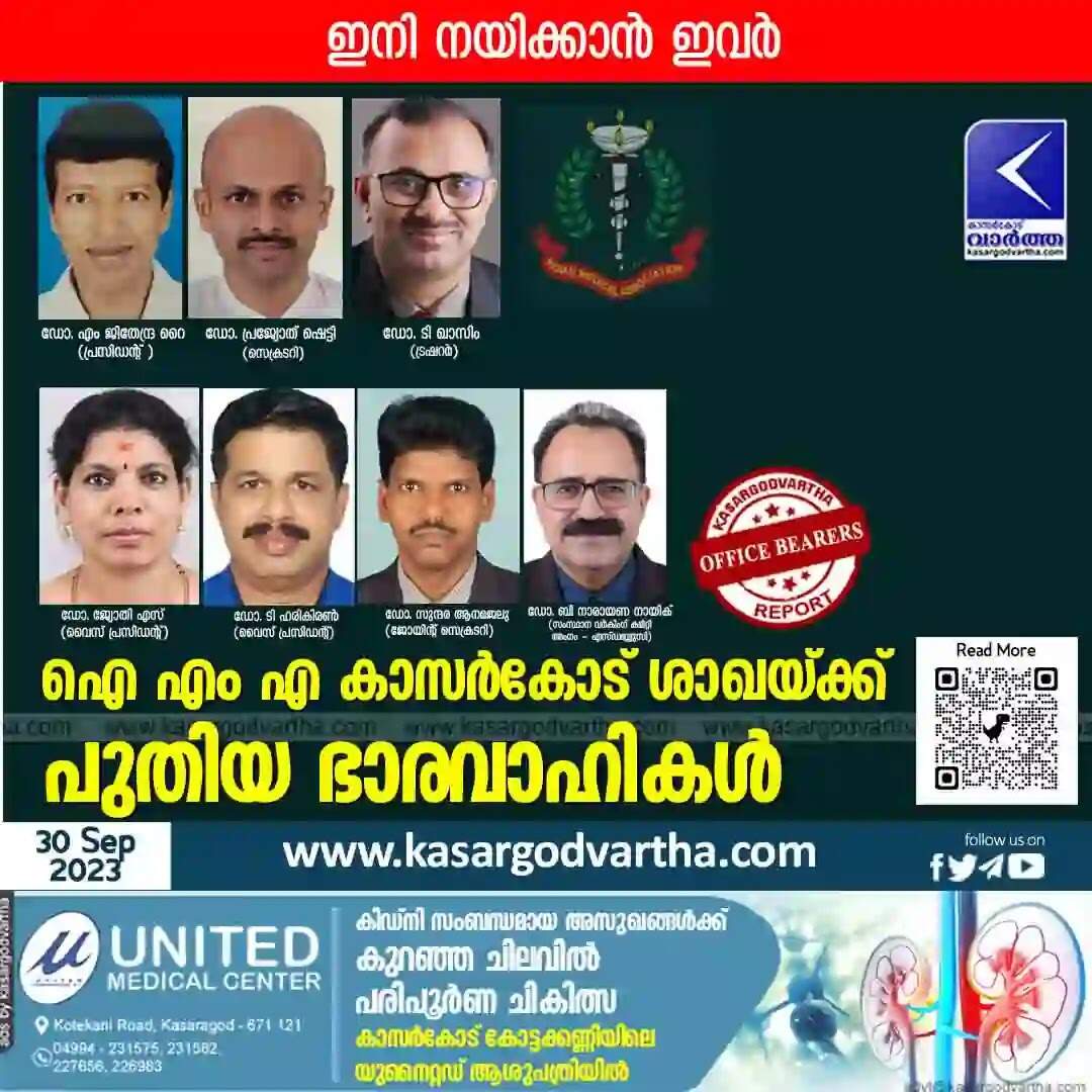 IMA | ഐ എം എ കാസർകോട് ശാഖയ്ക്ക് പുതിയ ഭാരവാഹികൾ; ഡോ. എം ജിതേന്ദ്ര റൈ പ്രസിഡന്റ്, ഡോ. പ്രജ്യോത് ഷെട്ടി സെക്രടറി, ഡോ. ടി ഖാസിം ട്രഷറർ