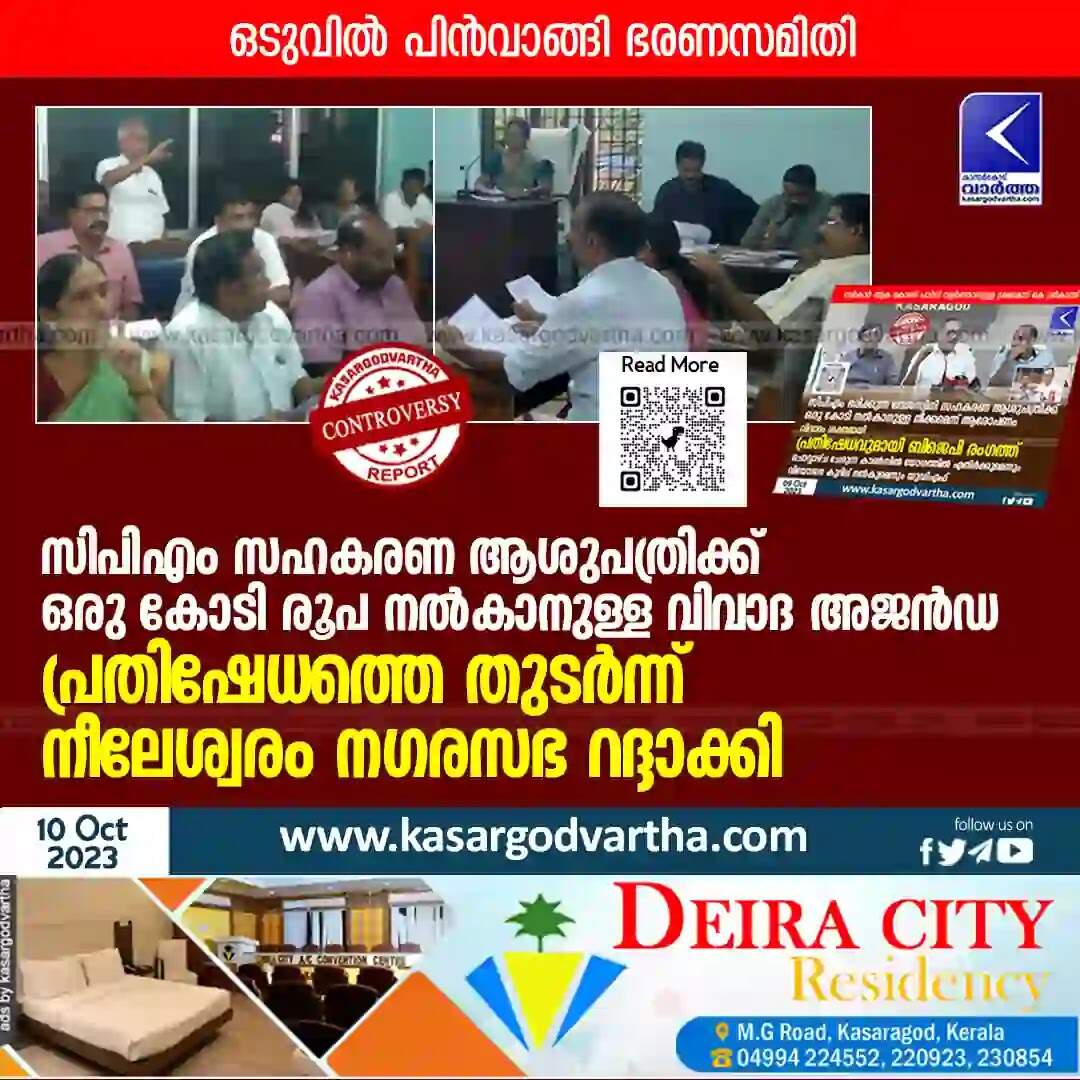 Cancelled | സിപിഎം സഹകരണ ആശുപത്രിക്ക് ഒരു കോടി രൂപ നൽകാനുള്ള വിവാദ അജൻഡ പ്രതിഷേധത്തെ തുടർന്ന് നീലേശ്വരം നഗരസഭ റദ്ദാക്കി