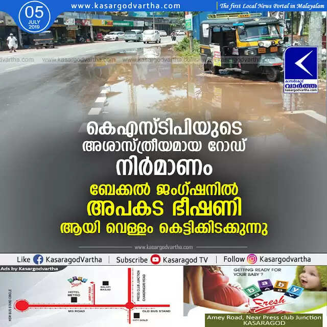 കെഎസ്ടിപിയുടെ അശാസ്ത്രീയമായ റോഡ് നിര്മാണം; ബേക്കല് ജംഗ്ഷനില് അപകട ഭീഷണി ആയി വെള്ളം കെട്ടിക്കിടക്കുന്നു