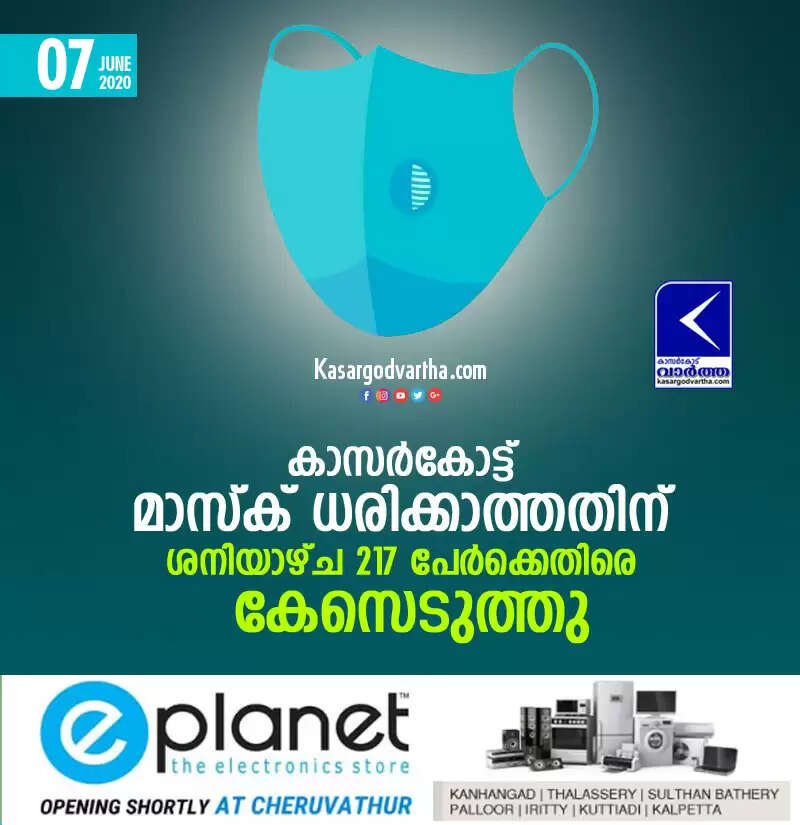 കാസര്കോട്ട് മാസ്ക് ധരിക്കാത്തതിന് ശനിയാഴ്ച 217 പേര്ക്കെതിരെ കേസെടുത്തു