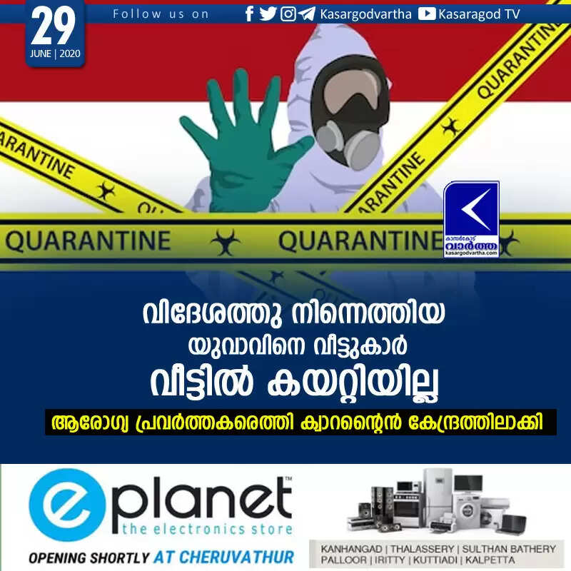 വിദേശത്തു നിന്നെത്തിയ യുവാവിനെ വീട്ടുകാര്‍ വീട്ടില്‍ കയറ്റിയില്ല; ആരോഗ്യ പ്രവര്‍ത്തകരെത്തി ക്വാറന്റൈന്‍ കേന്ദ്രത്തിലാക്കി