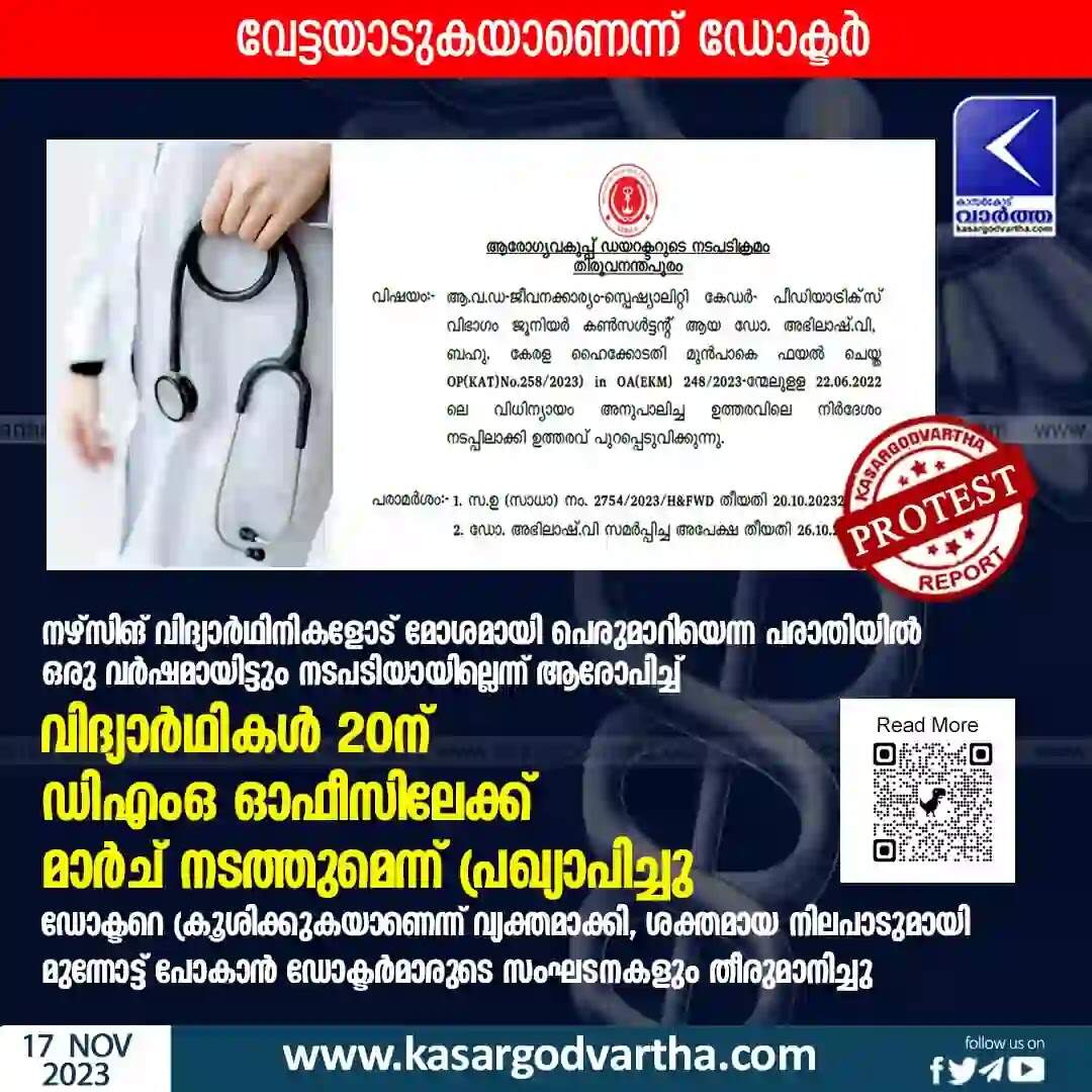 Protest | നഴ്‌സിങ് വിദ്യാർഥിനികളോട് മോശമായി പെരുമാറിയെന്ന പരാതിയില്‍ ഒരു വര്‍ഷമായിട്ടും നടപടിയായില്ലെന്ന് ആരോപിച്ച് വിദ്യാർഥികള്‍ 20ന് ഡിഎംഒ ഓഫീസിലേക്ക് മാര്‍ച് നടത്തുമെന്ന് പ്രഖ്യാപിച്ചു. ഡോക്ടറെ ക്രൂശിക്കുകയാണെന്ന് വ്യക്തമാക്കി, ശക്തമായ നിലപാടുമായി മുന്നോട്ട് പോകാന്‍ ഡോക്ടര്‍മാരുടെ സംഘടനകളും തീരുമാനിച്ചു; വെള്ളിയാഴ്ച രാത്രി ഡോക്ടര്‍മാരുടെ സംഘടന അടിയന്തരയോഗം വിളിച്ചു