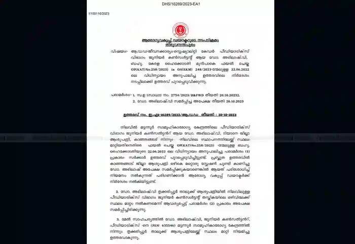ഡിവിഷന്‍ ബെഞ്ചിന്റെ ഉത്തരവിന്റെ അടിസ്ഥാനത്തില്‍ ആരോഗ്യവകുപ്പ് ഡയറക്ടര്‍ ഡോ. കെ ജെ റീന, കാഞ്ഞങ്ങാട് ജില്ലാ ആശുപത്രി ഒഴികെ മറ്റേതെങ്കിലും ആശുപത്രിയിലേക്ക് നിയമനം നല്‍കാമെന്ന് അറിയിച്ചതിന്റെ അടിസ്ഥാനത്തില്‍ ഡോ. അഭിലാഷിനെ തൃക്കരിപ്പൂര്‍ താലൂകാശുപത്രിയില്‍ നിലവിലുള്ള പീഡിയാട്രിക്‌സ് വിഭാഗം ജൂനിയർ കണ്‍സള്‍ടന്റായി നിയമിക്കുകയായിരുന്നു.