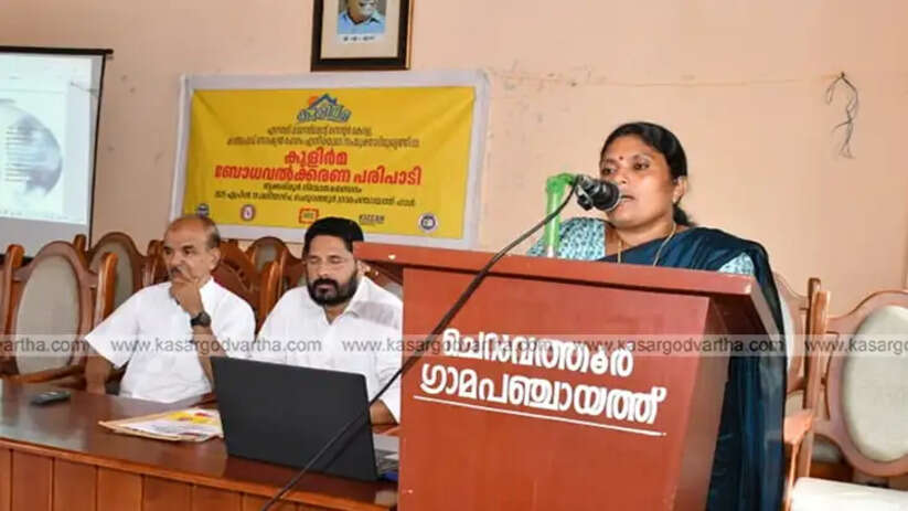 തൃക്കരിപ്പൂർ: (KasargodVartha) എനർജി മാനേജ്മെൻ്റ് കേരളയും കാൻഫെഡ് സോഷ്യൽ ഫോറവും ചേർന്ന് സംഘടിപ്പിച്ച 'കുളിർമ' ബോധവൽക്കരണ പരിപാടി ചെറുവത്തൂർ ഗ്രാമപഞ്ചായത്ത് ഇ.എം.എസ്. ഹാളിൽ നടന്നു. തൃക്കരിപ്പൂർ നിയോജക മണ്ഡലത്തിലെ പരിപാടിയിൽ പഞ്ചായത്ത് പ്രസിഡണ്ട് സി.വി. പ്രമീള 'കുളിർമ' പദ്ധതിയുടെ ഉദ്ഘാടനം നിർവഹിച്ചു.