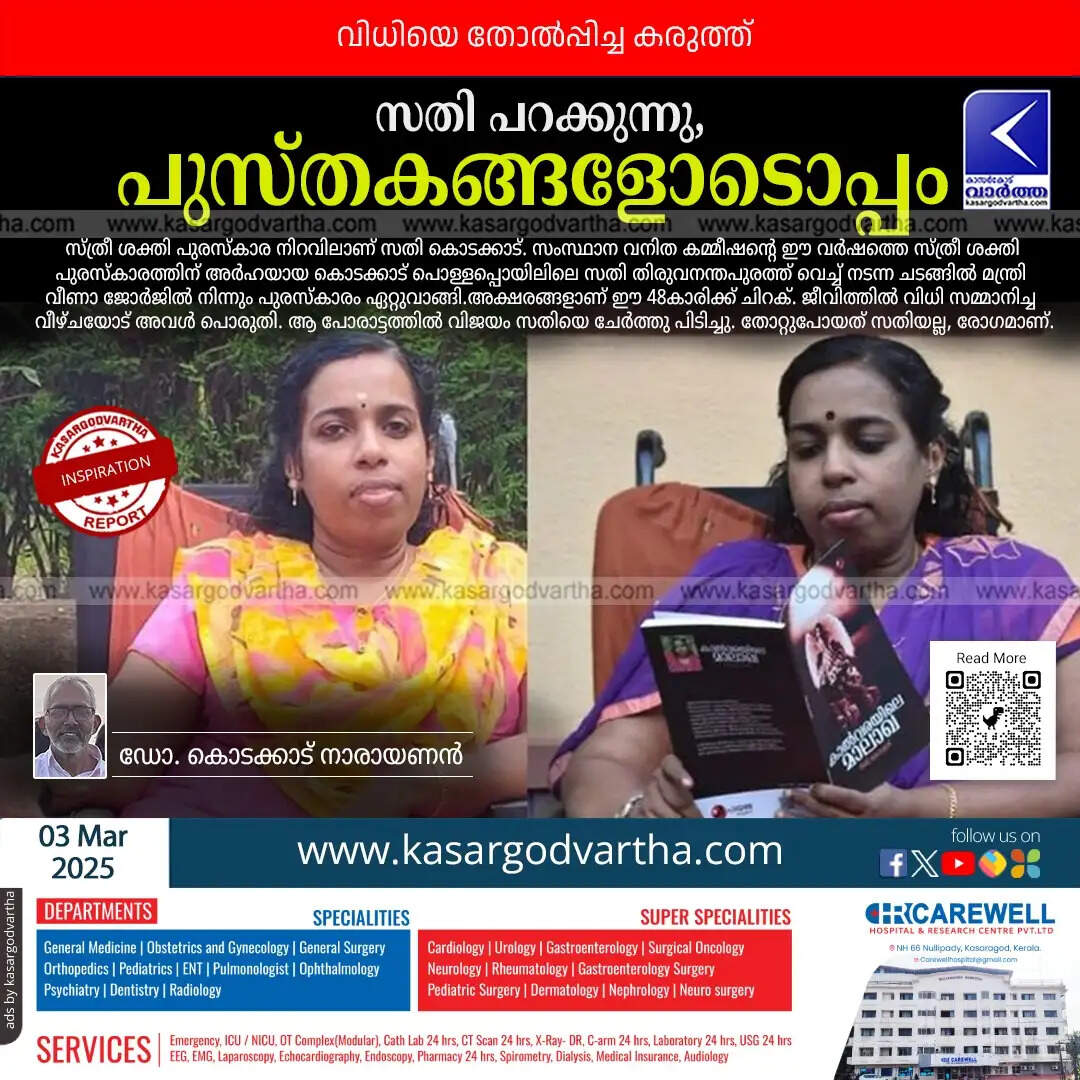 (KasargodVartha) സ്ത്രീ ശക്തി പുരസ്കാര നിറവിലാണ് സതി കൊടക്കാട്. സംസ്ഥാന വനിത കമ്മീഷൻ്റെ ഈ വർഷത്തെ സ്ത്രീ ശക്തി പുരസ്കാരത്തിന് അർഹയായ കൊടക്കാട് പൊള്ളപ്പൊയിലിലെ സതി തിരുവനന്തപുരത്ത് വെച്ച് നടന്ന ചടങ്ങിൽ മന്ത്രി വീണാ ജോർജിൽ നിന്നും പുരസ്കാരം ഏറ്റുവാങ്ങി. മണ്ണിൽ കാലുറപ്പിച്ചു നിൽക്കാൻ കഴിയാത്ത സതി കൊടക്കാട് എന്ന എഴുത്തുകാരി പറക്കുകയാണ്, പുസ്തകങ്ങളോടൊപ്പം. അക്ഷരങ്ങളാണ് ഈ 48കാരിക്ക് ചിറക്. ജീവിത്തിൽ വിധി സമ്മാനിച്ച വീഴ്ചയോട് അവൾ പൊരുതി. ആ പോരാട്ടത്തിൽ വിജയം സതിയെ ചേർത്തു പിടിച്ചു. തോറ്റുപോയത് സതിയല്ല, രോഗമാണ്.