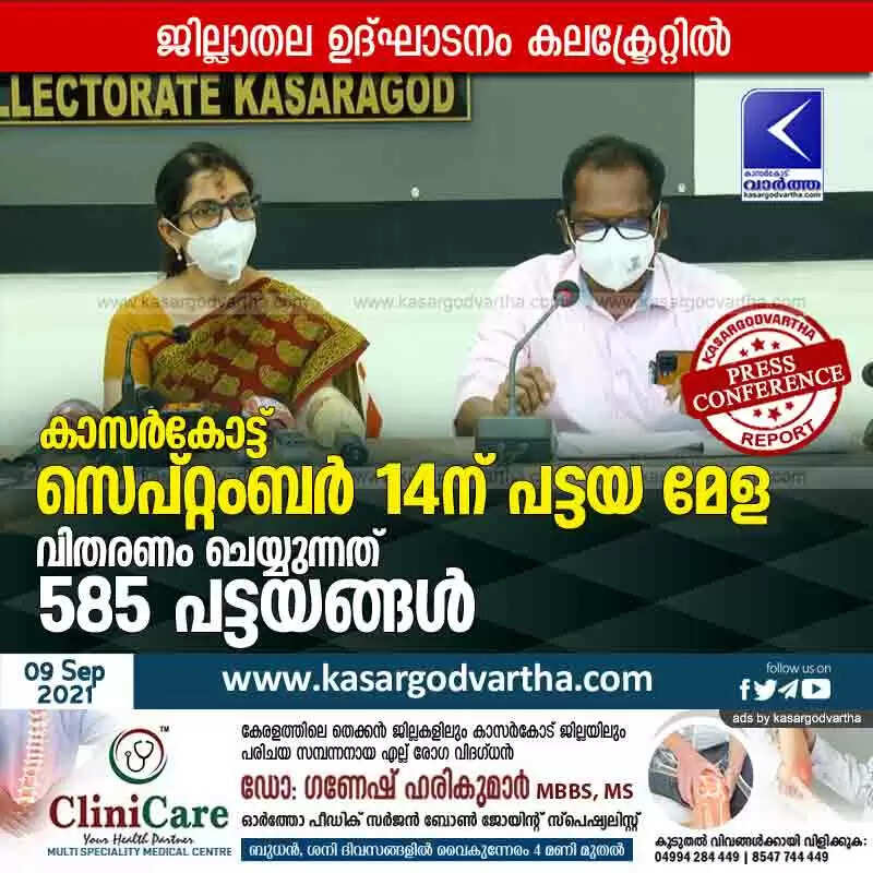 കാസർകോട്: (www.kasargodvartha.com 09.09.2021) സംസ്ഥാന സര്‍കാരിന്റെ 100 ദിന കര്‍മപരിപാടിയുടെ ഭാഗമായി എല്ലാവര്‍ക്കും ഭൂമി എന്ന ലക്ഷ്യം പൂര്‍ത്തീകരിക്കുന്നതിനായുള്ള പട്ടയമേള സെപ്റ്റംബര്‍ 14 ന് ജില്ലയിലെ വിവിധ താലൂകുകളില്‍ നടക്കുമെന്ന് ജില്ലാ കലക്ടര്‍ സ്വാഗത് ഭണ്ഡാരി രണ്‍വീര്‍ ചന്ദ് വാർത്താസമ്മേളനത്തിൽ അറിയിച്ചു. ജില്ലാതല ഉദ്ഘാടനം രാവിലെ 11.30 ന് കലക്ട്രേറ്റ് മെയിന്‍ കോണ്‍ഫറന്‍സ് ഹാളില്‍ ജില്ലയുടെ ചുമതലയുള്ള തുറമുഖ പുരാവസ്തു വകുപ്പ് മന്ത്രി അഹ്‌മദ്‌ ദേവര്‍കോവില്‍ നിര്‍വഹിക്കും.