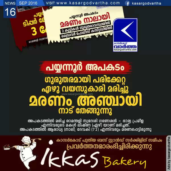 പയ്യന്നൂര് അപകടം; ഗുരുതരമായി പരിക്കേറ്റ ഏഴു വയസുകാരി മരിച്ചു, മരണം അഞ്ചായി, നാട് തേങ്ങുന്നു