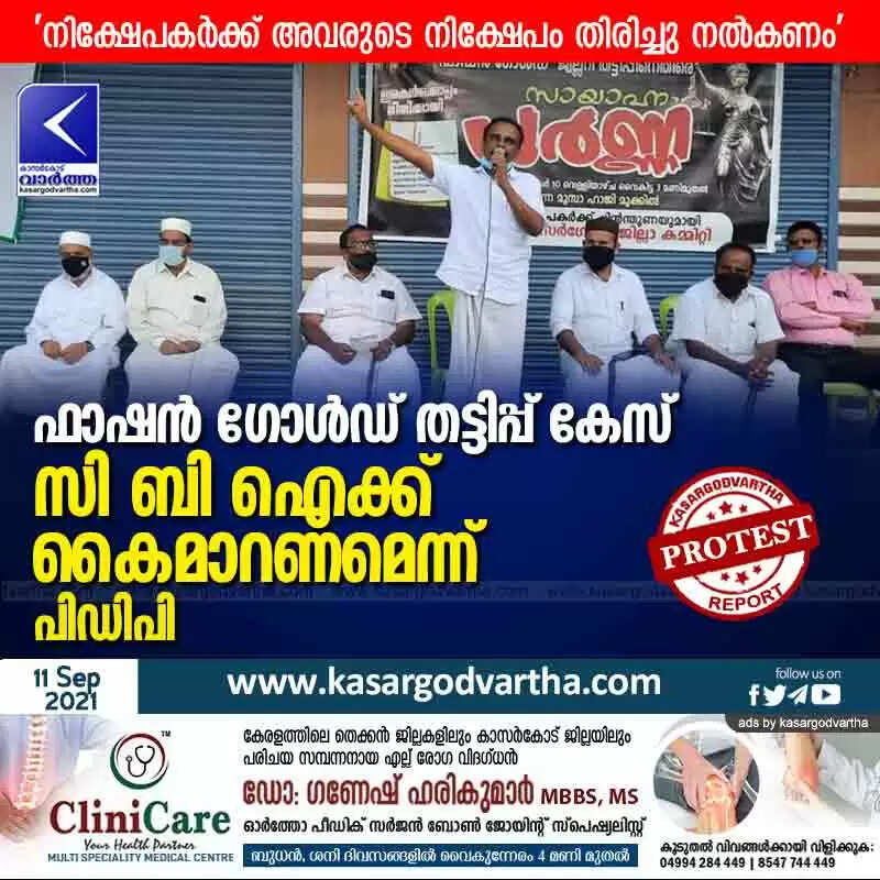 പടന്ന: (www.kasargodvartha.com 11.09.2021) ഫാഷന് ഗോള്ഡ് തട്ടിപ്പ് കേസ് സി ബി ഐക്ക് കൈമാറണമെന്ന് പിഡിപി ആവശ്യപ്പെട്ടു. നിക്ഷേപകര്ക്ക് അവരുടെ നിക്ഷേപം തിരിച്ചു നല്കണമെന്നാവശ്യവുമായി പടന്നയില് സായാഹ്ന ധർണയും സംഘടിപ്പിച്ചു.