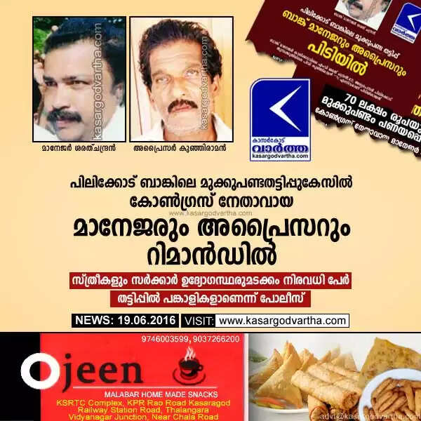പിലിക്കോട് ബാങ്കിലെ മുക്കുപണ്ടതട്ടിപ്പുകേസില് കോണ്ഗ്രസ് നേതാവായ മാനേജരും അപ്രൈസറും റിമാന്ഡില്