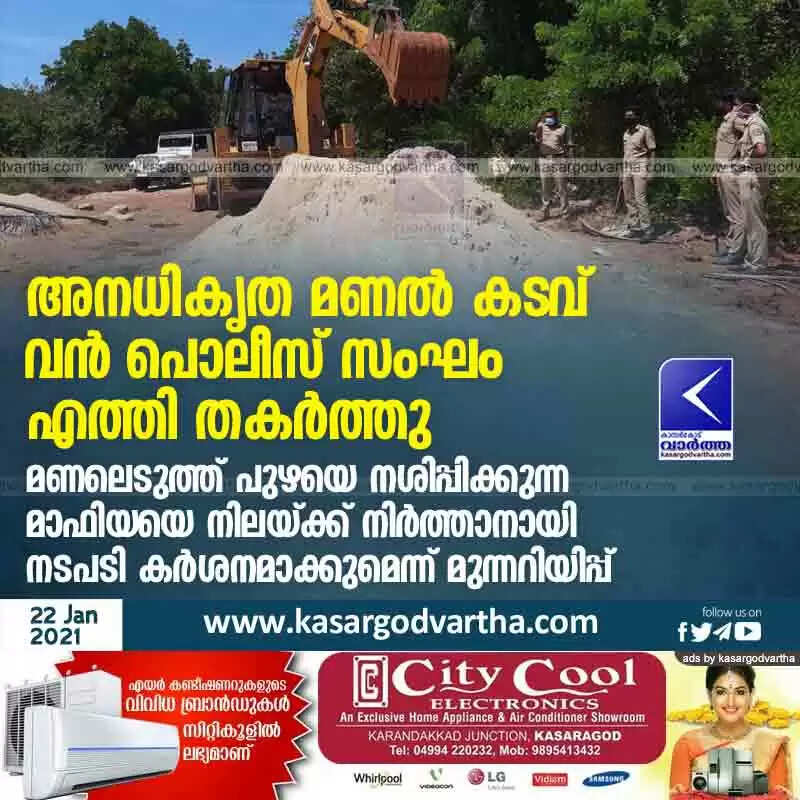 Keywords: Kerala, News, Kasaragod, Uppala, Illegal sand, Sand, Harber, Police, Top-Headlines, Police destroy illegal sand harbour.