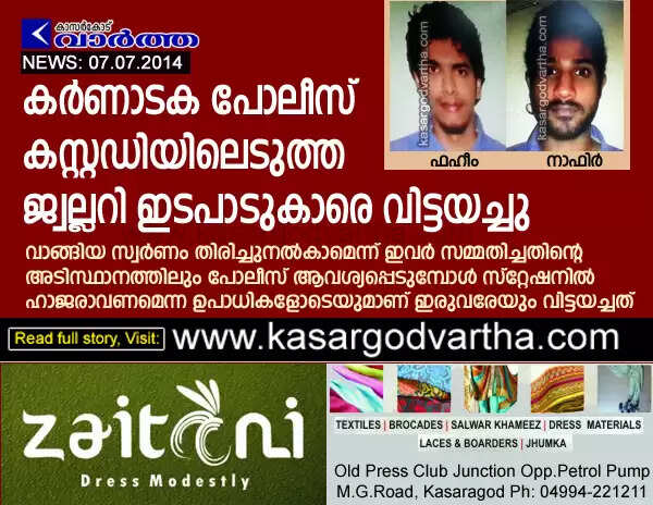 കര്ണാടക പോലീസ് കസ്റ്റഡിയിലെടുത്ത ജ്വല്ലറി ഇടപാടുകാരെ വിട്ടയച്ചു