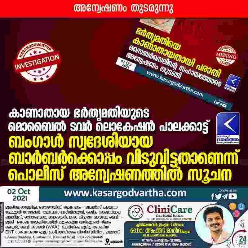 കാണാതായ ഭര്തൃമതിയുടെ മൊബൈൽ ടവർ ലൊകേഷൻ പാലക്കാട്ട്; ബംഗാൾ സ്വദേശിയായ ബാർബർക്കൊപ്പം വീടുവിട്ടതാണെന്ന് പൊലീസ് അന്വേഷണത്തിൽ സൂചന