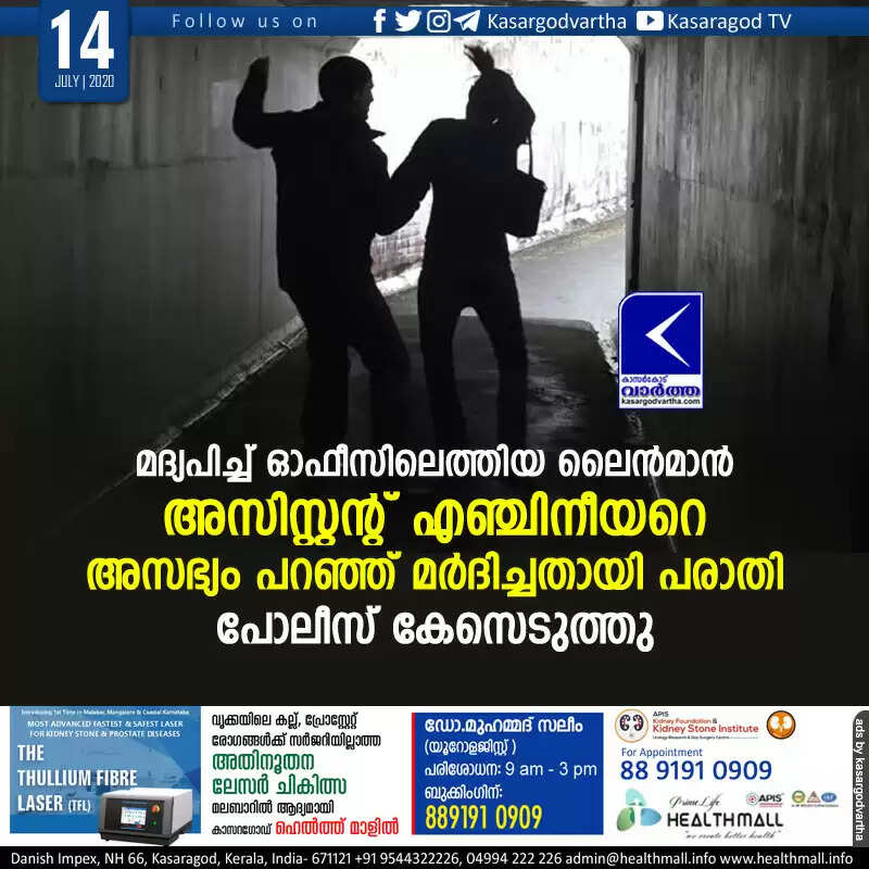 മദ്യപിച്ച് ഓഫീസിലെത്തിയ ലൈന്‍മാന്‍ അസിസ്റ്റന്റ് എഞ്ചിനീയറെ അസഭ്യം പറഞ്ഞ് മര്‍ദിച്ചതായി പരാതി; പോലീസ് കേസെടുത്തു