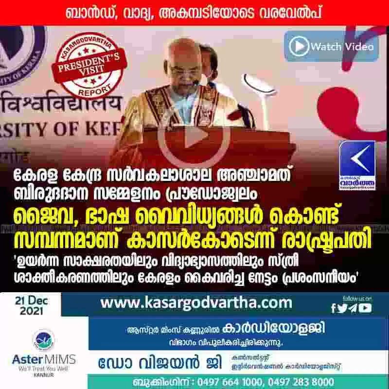 Keywords:  Kerala, News, Kasaragod, Periya, Ram Nath Kovind In Kasaragod, Top-Headlines, Visit, President, Central University, President lauded the achievements of Kerala in high literacy, education and women empowerment.
