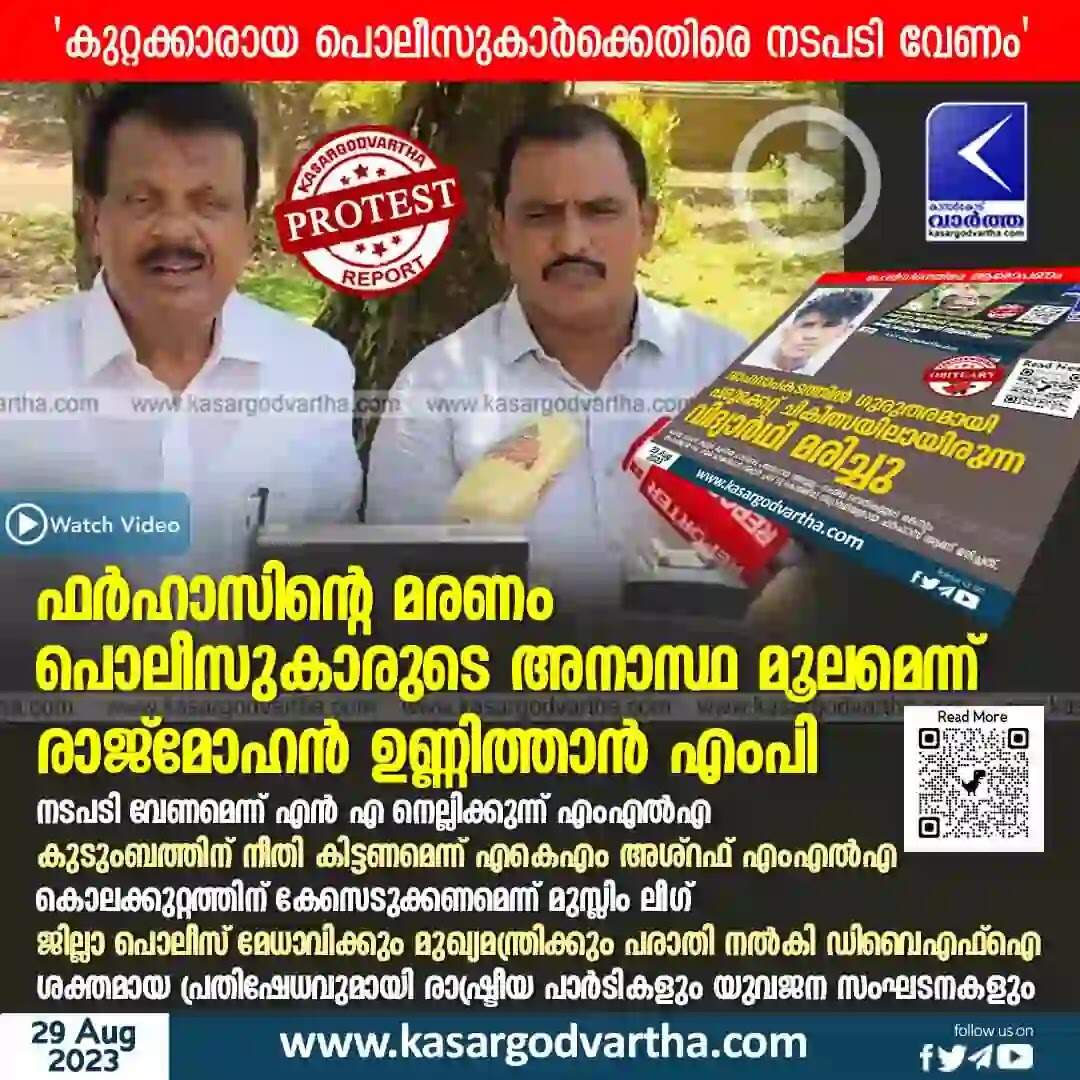Protest | ഫര്ഹാസിന്റെ മരണം പൊലീസുകാരുടെ അനാസ്ഥ മൂലമെന്ന് രാജ്മോഹന് ഉണ്ണിത്താന് എംപി; നടപടി വേണമെന്ന് എന് എ നെല്ലിക്കുന്ന് എംഎല്എ; കുടുംബത്തിന് നീതി കിട്ടണമെന്ന് എകെഎം അശ്റഫ് എംഎല്എ; കൊലക്കുറ്റത്തിന് കേസെടുക്കണമെന്ന് മുസ്ലിം ലീഗ്; ജില്ലാ പൊലീസ് മേധാവിക്കും മുഖ്യമന്ത്രിക്കും പരാതി നല്കി ഡിവൈഎഫ്ഐ; ശക്തമായ പ്രതിഷേധവുമായി രാഷ്ട്രീയ പാര്ടികളും യുവജന സംഘടനകളും
