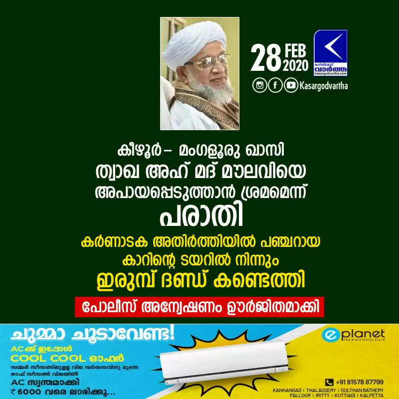 കീഴൂര്‍- മംഗളൂരു ഖാസി ത്വാഖ അഹ് മദ് മൗലവിയെ അപായപ്പെടുത്താന്‍ ശ്രമമെന്ന് പരാതി; കര്‍ണാടക അതിര്‍ത്തിയില്‍ പഞ്ചറായ കാറിന്റെ ടയറില്‍ നിന്നും ഇരുമ്പ് ദണ്ഡ് കണ്ടെത്തി, പോലീസ് അന്വേഷണം ഊര്‍ജിതമാക്കി
