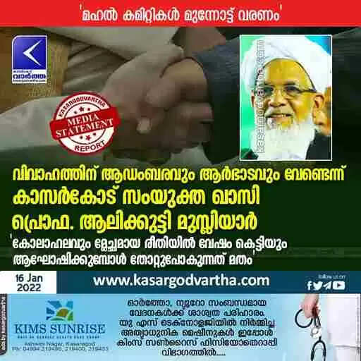 വിവാഹത്തിന് ആഡംബരവും ആർഭാടവും വേണ്ടെന്ന് കാസർകോട് സംയുക്ത ഖാസി; 'കോലാഹലവും മ്ലേച്ഛമായ രീതിയിൽ വേഷം കെട്ടിയും ആഘോഷിക്കുമ്പോൾ തോറ്റുപോകുന്നത് മതം'; മഹൽ കമിറ്റികൾ മുന്നോട്ട് വരണമെന്നും പ്രൊഫ. ആലിക്കുട്ടി മുസ്ലിയാർ