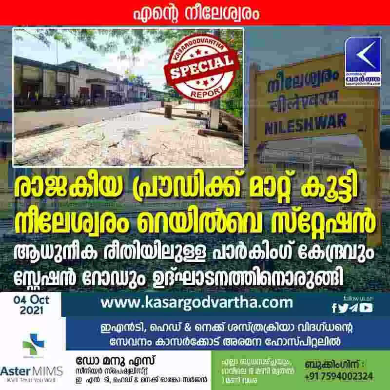 രാജകീയ പ്രൗഡിക്ക് മാറ്റ് കൂട്ടി നീലേശ്വരം റെയിൽവെ സ്റ്റേഷൻ; ആധുനീക രീതിയിലുള്ള പാർകിംഗ് കേന്ദ്രവും സ്റ്റേഷൻ റോഡും ഉദ്ഘാടനത്തിനൊരുങ്ങി