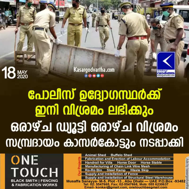 പോലീസ് ഉദ്യോഗസ്ഥര്‍ക്ക് ഇനി വിശ്രമം ലഭിക്കും; ഒരാഴ്ച ഡ്യൂട്ടി ഒരാഴ്ച വിശ്രമം സമ്പ്രദായം കാസര്‍കോട്ടും നടപ്പാക്കി