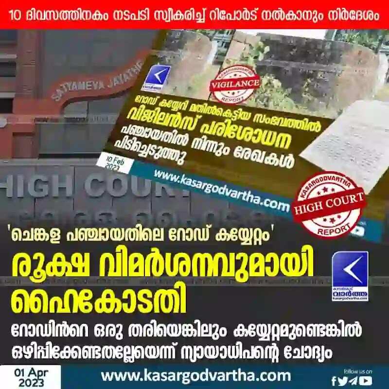 High Court | 'ചെങ്കള പഞ്ചായതിലെ റോഡ് കയ്യേറ്റം': രൂക്ഷ വിമര്‍ശനവുമായി ഹൈകോടതി; റോഡിന്റെ ഒരു തരിയെങ്കിലും കയ്യേറ്റമുണ്ടെങ്കില്‍ ഒഴിപ്പിക്കേണ്ടതല്ലേയെന്ന് ന്യായാധിപന്റെ ചോദ്യം; 10 ദിവസത്തിനകം നടപടി സ്വീകരിച്ച് റിപോര്‍ട് നല്‍കാനും നിര്‍ദേശം