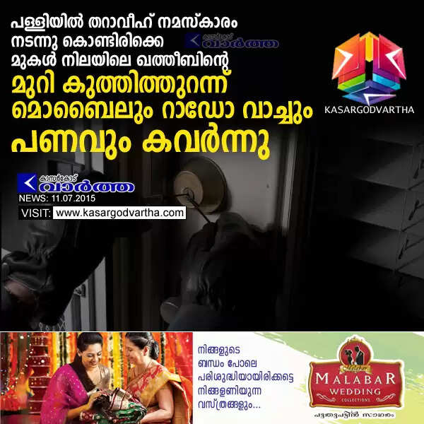 പള്ളിയില് തറാവീഹ് നമസ്കാരം നടന്നു കൊണ്ടിരിക്കെ മുകള് നിലയിലെ ഖത്തീബിന്റെ മുറി കുത്തിത്തുറന്ന് മൊബൈലും റാഡോ വാച്ചും പണവും കവര്ന്നു
