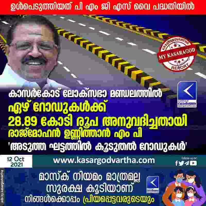 Keywords: Kerala, News, Kasaragod, Top-Headlines, Rajmohan Unnithan, MP, Road, Development project, Fund, Rs 28.89 crore allotted for seven roads in Kasargod Lok Sabha constituency; says Rajmohan Unnithan MP.