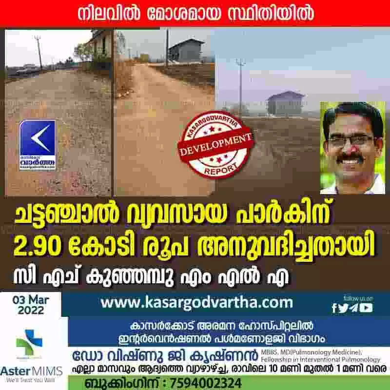 Keywords:  Uduma, Kerala, Kasaragod, News, Chattanchal, Development project, MLA, Top-Headlines, Panchayath, Engineering Agency, Chemnad, Road, Industrial Park, Rs 2.90 crore has been allotted for Chattanchal Industrial Park: CH Kunjambu MLA.
