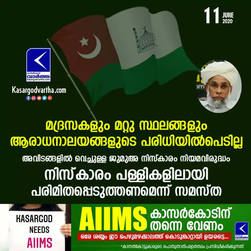 മദ്രസകളും മറ്റു സ്ഥലങ്ങളും ആരാധനാലയങ്ങളുടെ പരിധിയില്പെടില്ല; അവിടങ്ങളില് വെച്ചുള്ള ജുമുഅ നിസ്കാരം നിയമവിരുദ്ധം, നിസ്കാരം പള്ളികളിലായി പരിമിതപ്പെടുത്തണമെന്ന് സമസ്ത