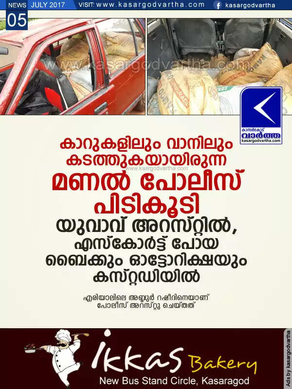 Keywords: Kasaragod, Kerala, news, arrest, Police, sand mafia, custody, Sand trafficking; youth arrested