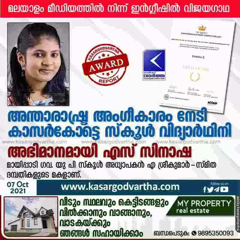 കാസർകോട്: (www.kasargodvartha.com 07.10.2021) അന്താരാഷ്ട്ര അംഗീകാരം നേടി കാസർകോട്ടെ സ്‌കൂൾ വിദ്യാർഥിനി. ലൻഡൻ ആസ്ഥാനമായ റോയൽ കോമൺവെൽത് സൊസൈറ്റി അംഗ രാജ്യങ്ങളിലെ കുട്ടികൾക്കായി നടത്തിയ സാഹിത്യ മത്സരത്തിൽ ഗോൾഡ് ഫൈനലിസ്റ്റ് അവാർഡ് സ്വന്തമാക്കിയാണ് മായിപ്പാടിയിലെ എസ് സിനാഷ നേട്ടം കൈവരിച്ചത്. കാസർകോട് ഗവ. ഹയർ സെകൻഡറി സ്‌കൂളിലെ ഒമ്പതാം ക്ലാസ് വിദ്യാർഥിനിയാണ്.