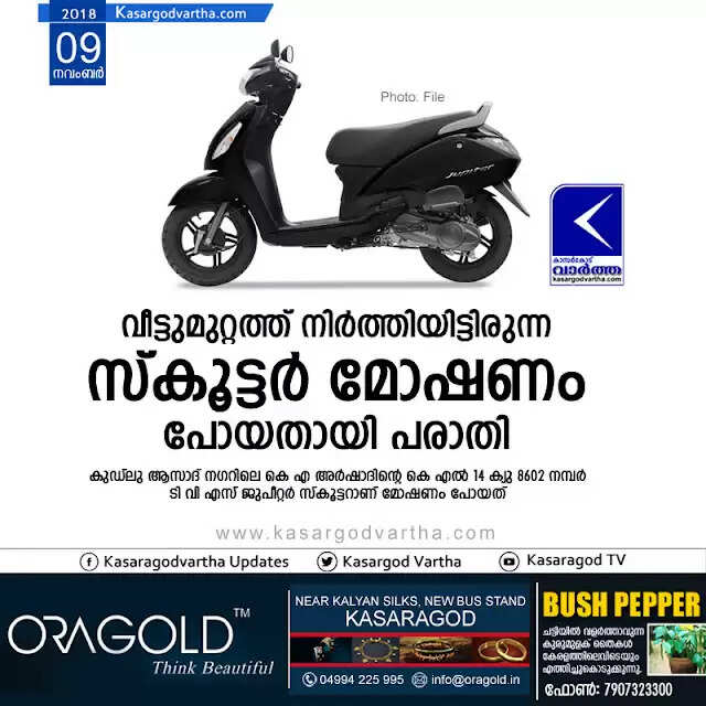 കാസര്കോട്: (www.kasargodvartha.com 09.11.2018) വീട്ടുമുറ്റത്ത് നിര്ത്തിയിട്ടിരുന്ന സ്കൂട്ടര് മോഷണം പോയതായി പരാതി. കുഡ്ലു ആസാദ് നഗറിലെ കെ എ അര്ഷാദിന്റെ കെ എല് 14 ക്യു 8602 നമ്പര് ടി വി എസ് ജുപീറ്റര് സ്കൂട്ടറാണ് മോഷണം പോയത്.