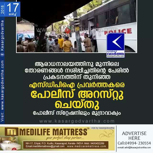 ആരാധനാലയത്തിനു മുന്നിലെ തോരണങ്ങള്‍ നശിപ്പിച്ചതിന്റെ പേരില്‍ പ്രകടനത്തിന് തുനിഞ്ഞ എസ്ഡിപിഐ പ്രവര്‍ത്തകരെ പോലീസ് അറസ്റ്റു ചെയ്തു; പോലീസ് സ്‌റ്റേഷനിലും മുദ്രാവാക്യം