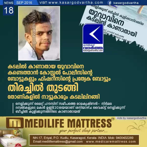 കാസര്‍കോട്: (www.kasargodvartha.com 17/09/2016) സുഹൃത്തുക്കള്‍ക്കൊപ്പം കടലില്‍ കുളിക്കുന്നതിനിടെ തിരമാലകളില്‍പ്പെട്ട് കടലില്‍ കാണാതായ യുവാവിനെ കണ്ടെത്തുന്നതിനായി ഞായറാഴ്ച രാവിലെ മുതല്‍ തിരച്ചില്‍ പുനരാരംഭിച്ചു. ശനിയാഴ്ച വൈകുന്നേരം നെല്ലിക്കുന്ന് ബീച്ചില്‍ കുളിക്കുന്നതിനിടെ കാണാതായ നെല്ലിക്കുന്ന് ലൈറ്റ് ഹൗസിന് സമീപത്തെ രാമകൃഷ്ണന്‍- നിര്‍മല ദമ്പതികളുടെ മകന്‍ ഉണ്ണി(20)ക്കുവേണ്ടി നടത്തിയ തിരച്ചില്‍ രാത്രി വൈകുംവരെ നീണ്ടു.